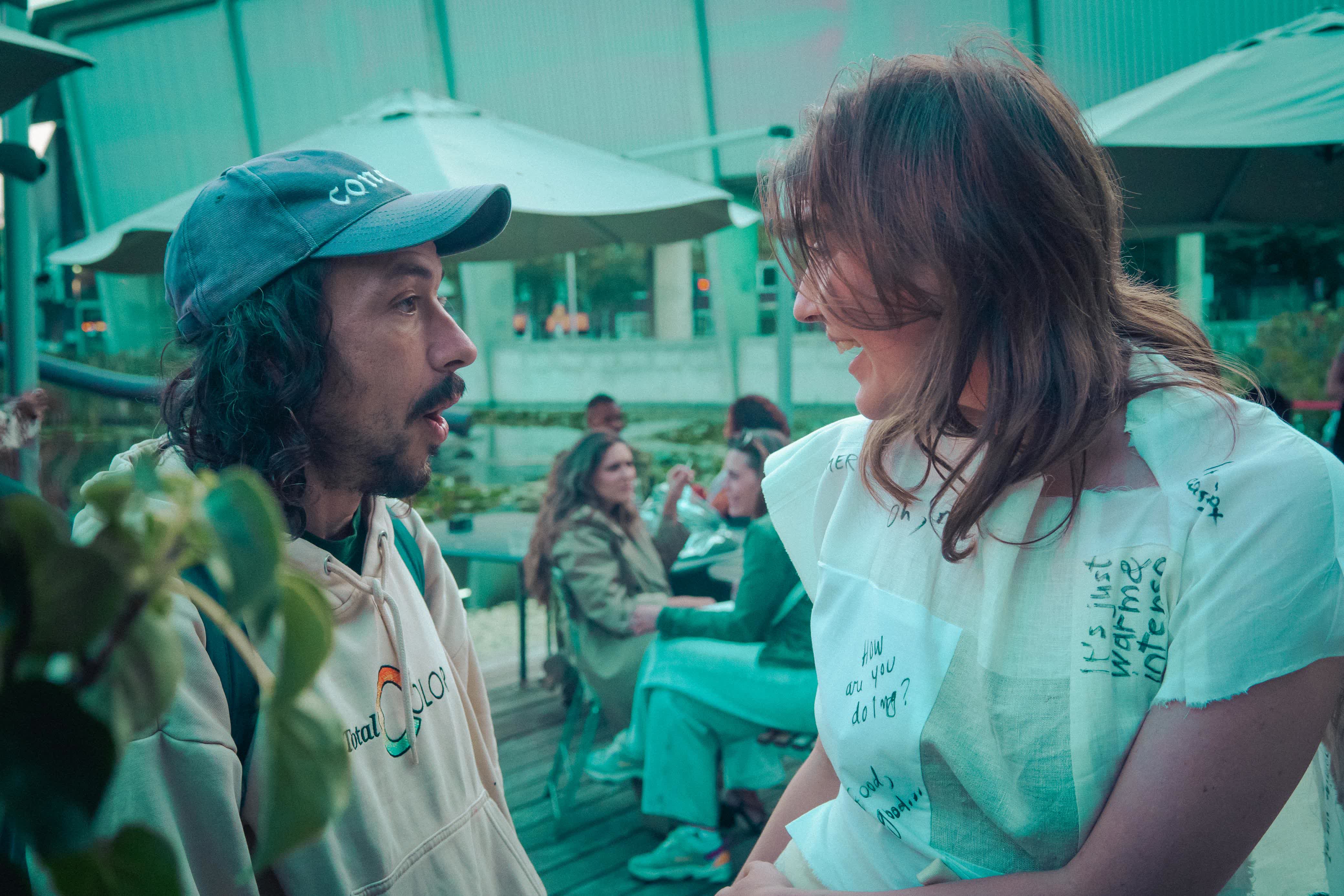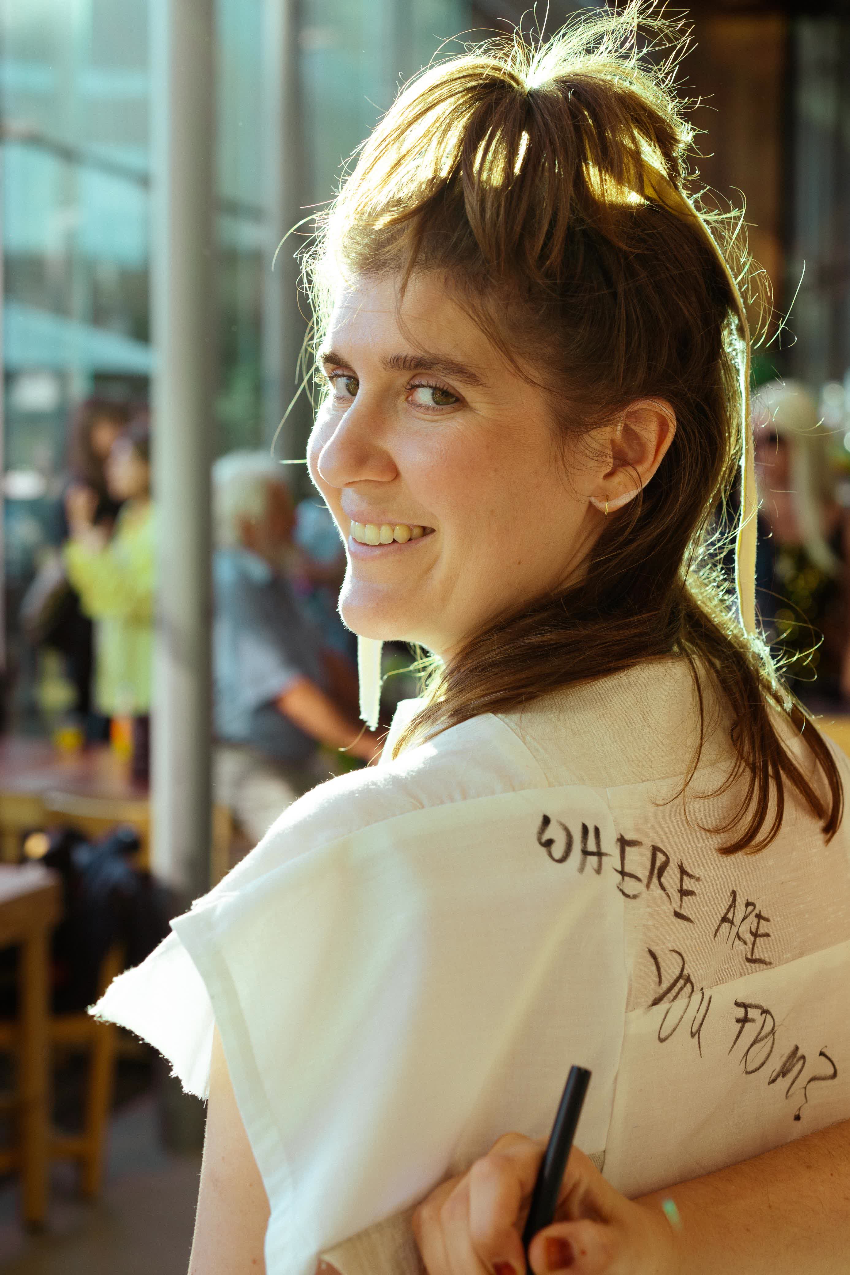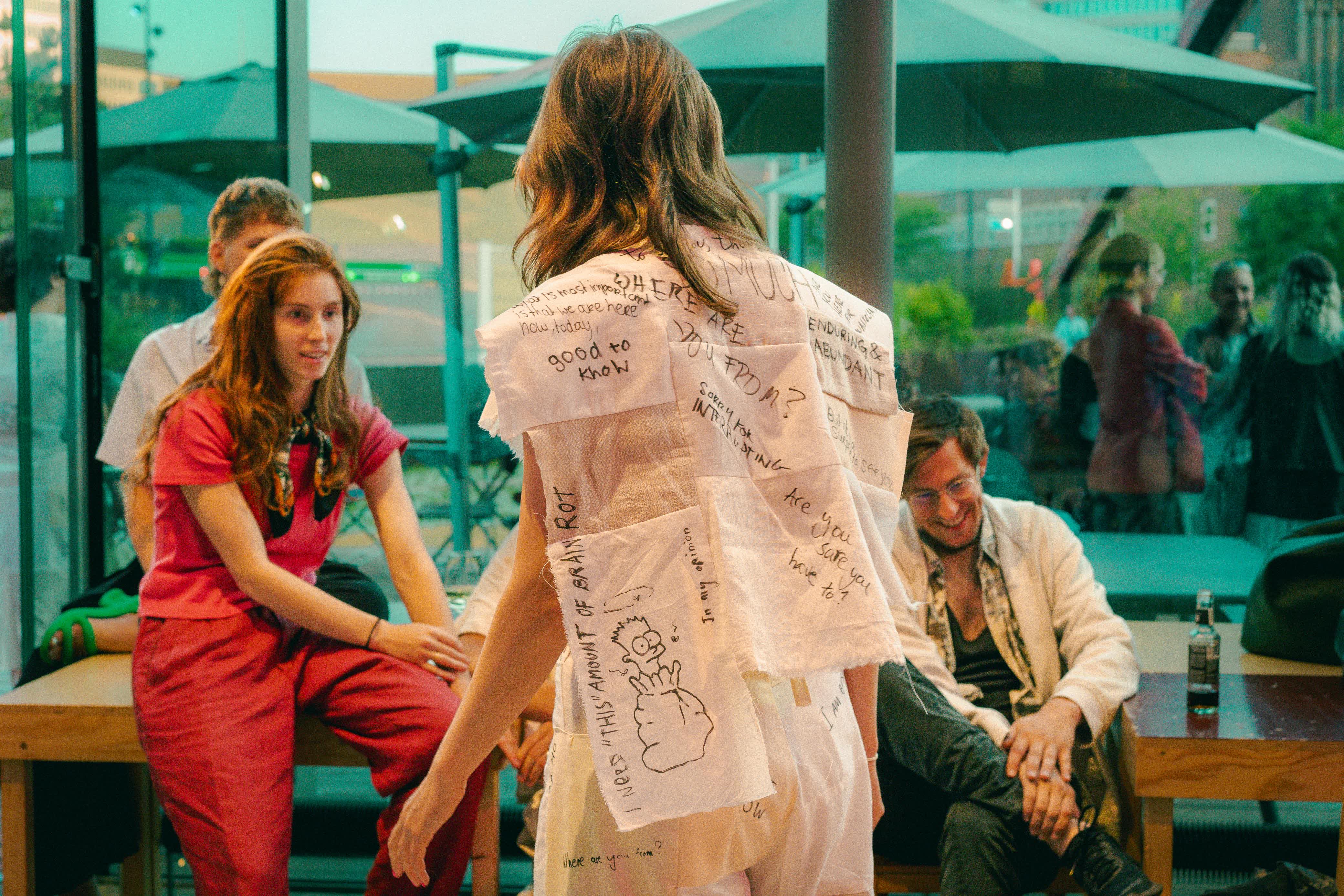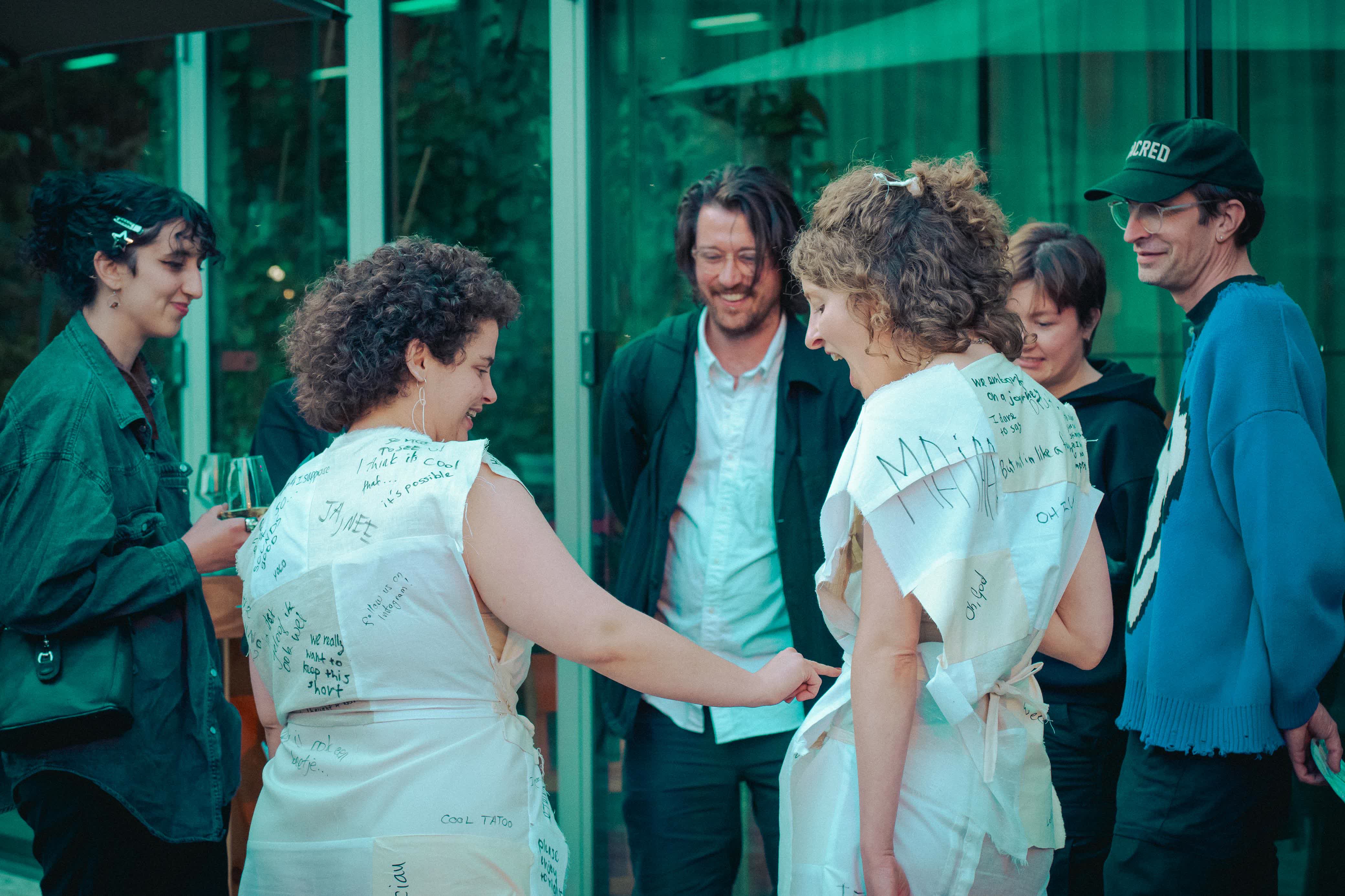 In the first part of the performance, overheard chatter provided us with linguistic material to recycle. We eavesdropped, catching wasteful phrases and writing them directly onto our costumes, designed and sewn from repurposed fabric, in collaboration with Celine Caly.