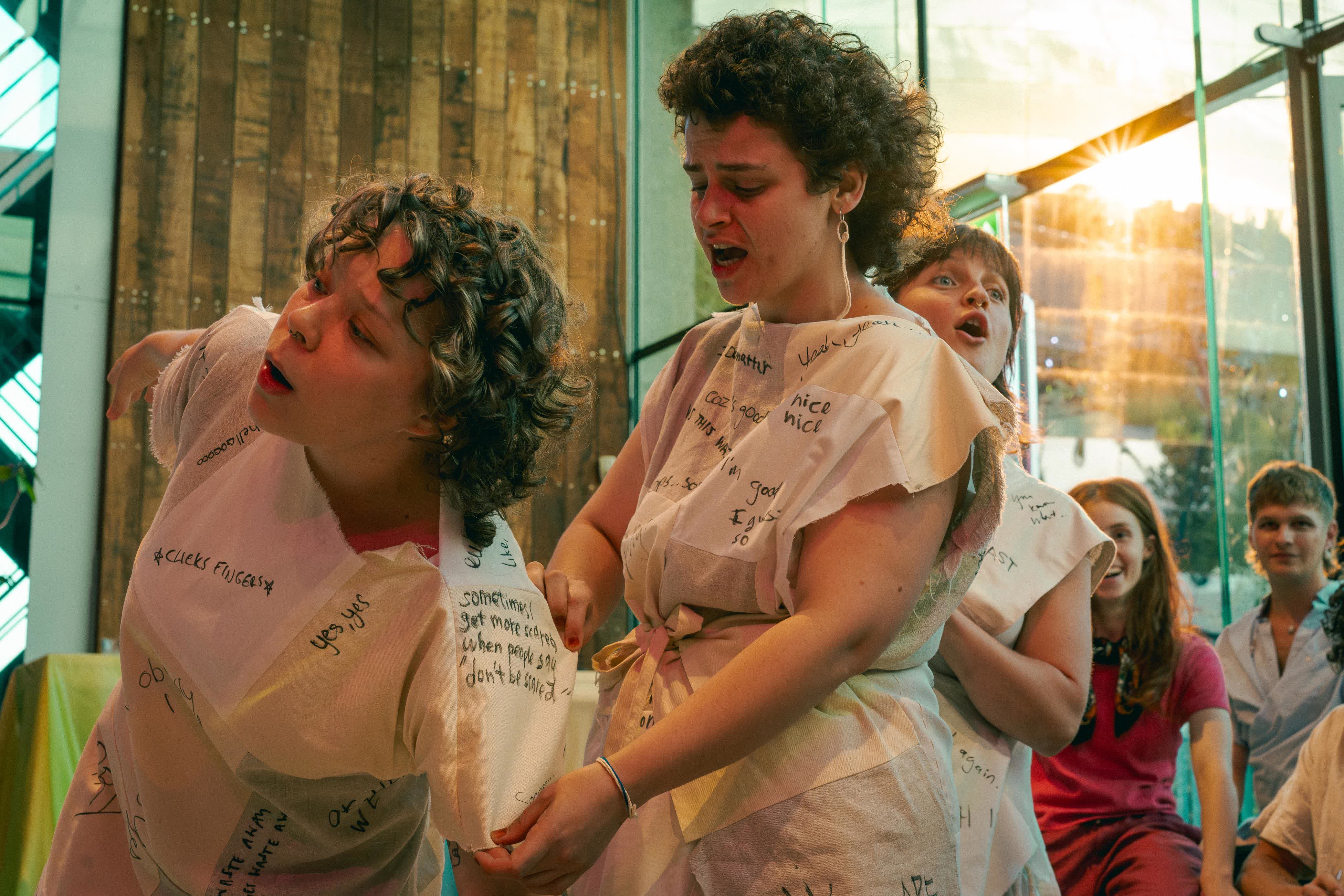 In the second part of the performance, we vocally activated this “vacuous” libretto - the collected language written all over our costumes. We found temporary stages amongst the audience, they heard their words echoed back in an improvised and playful manner; singing, whispering, reading, repeating and declaiming.