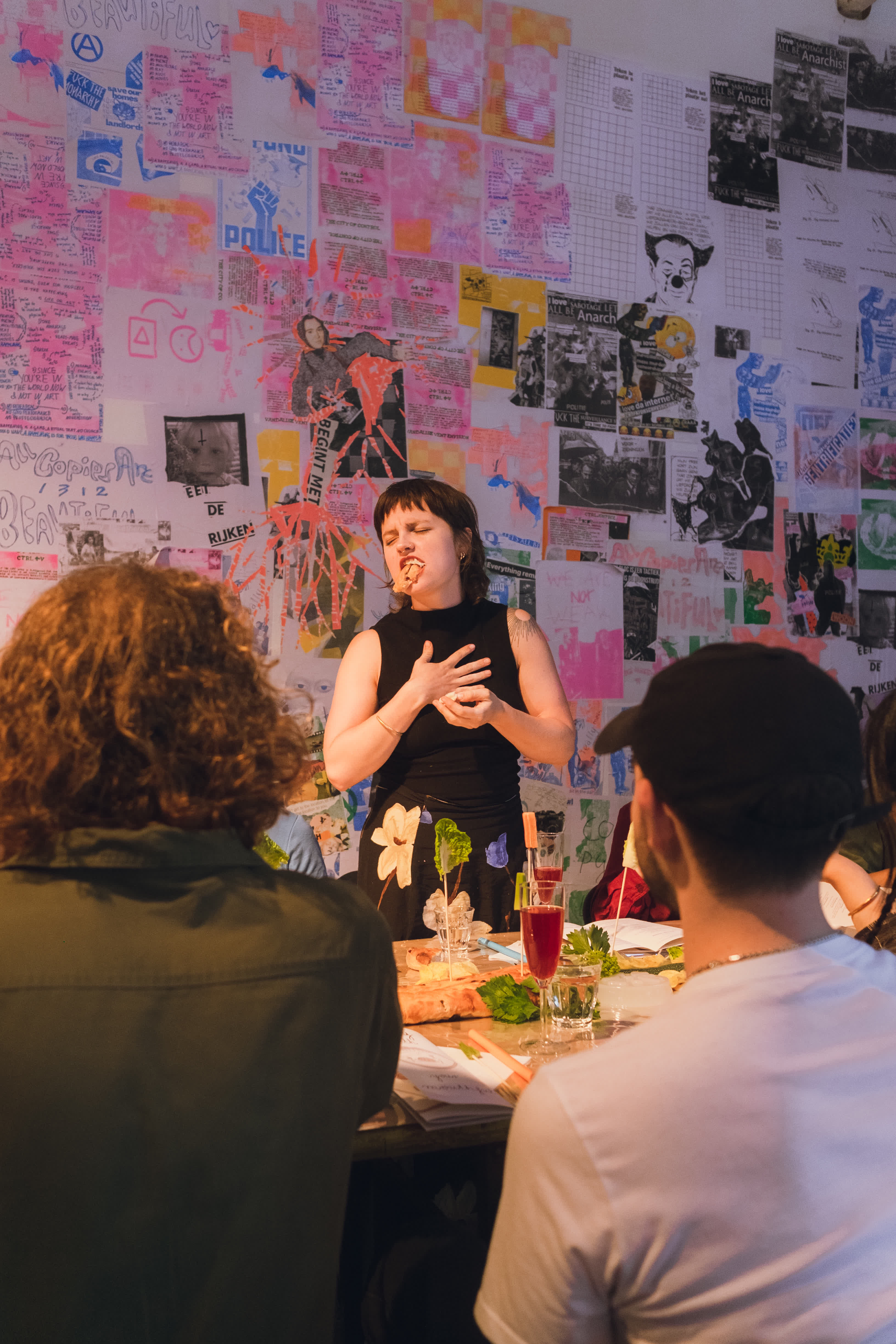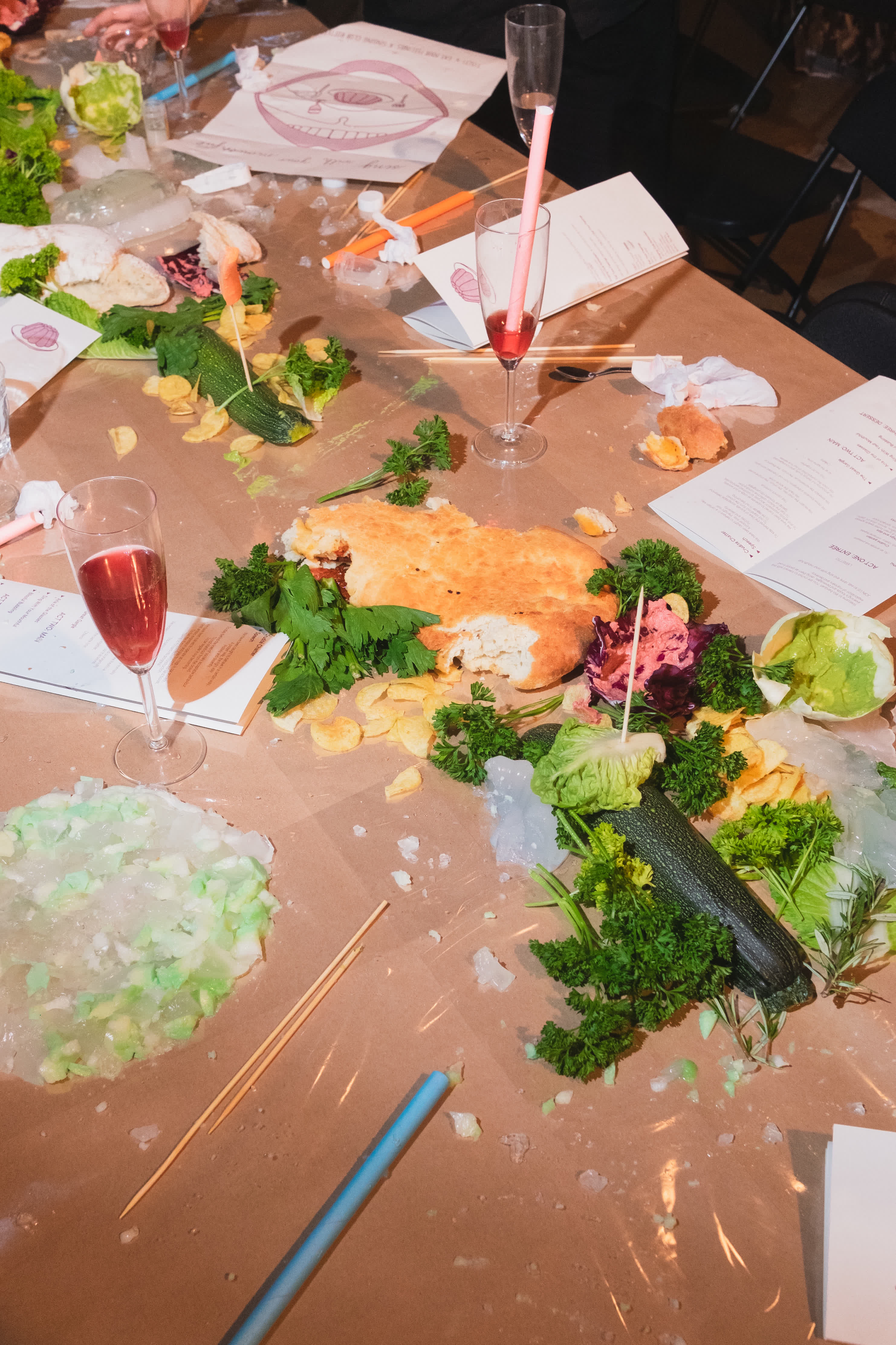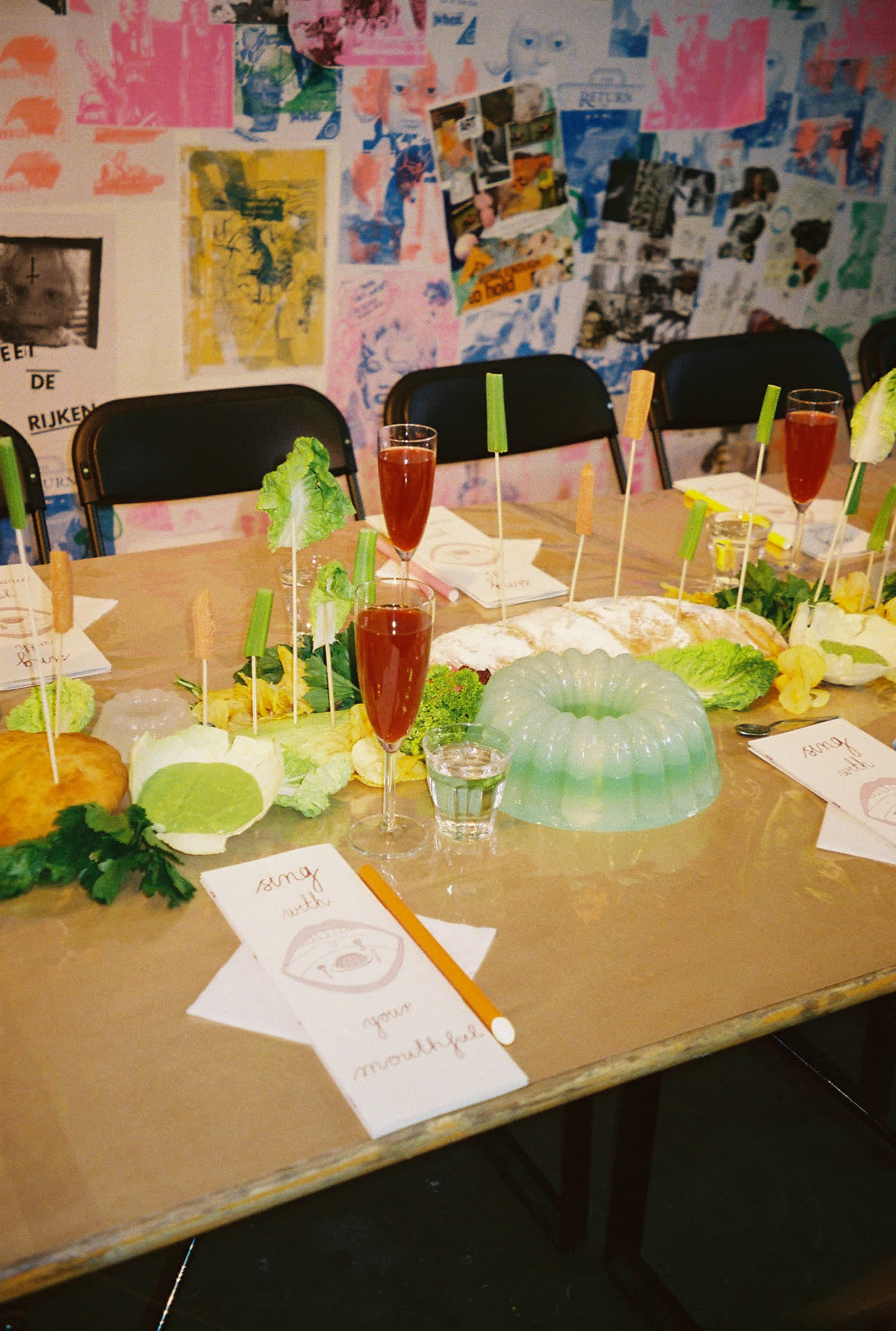 Sing With Your Mouthful is a performative banquet where food and vocal composition merge. The audience was guest, witness and participant in the experimental happening. As the dinner progressed, everything became messy both physically and sonically. There was gargling, singing with a mouthful of food, bubbles blown into the "wine," and conversations continued in shouts from one end of the table to the other. Dining conventions and etiquette were questioned, and the audience was invited to join in on everything.