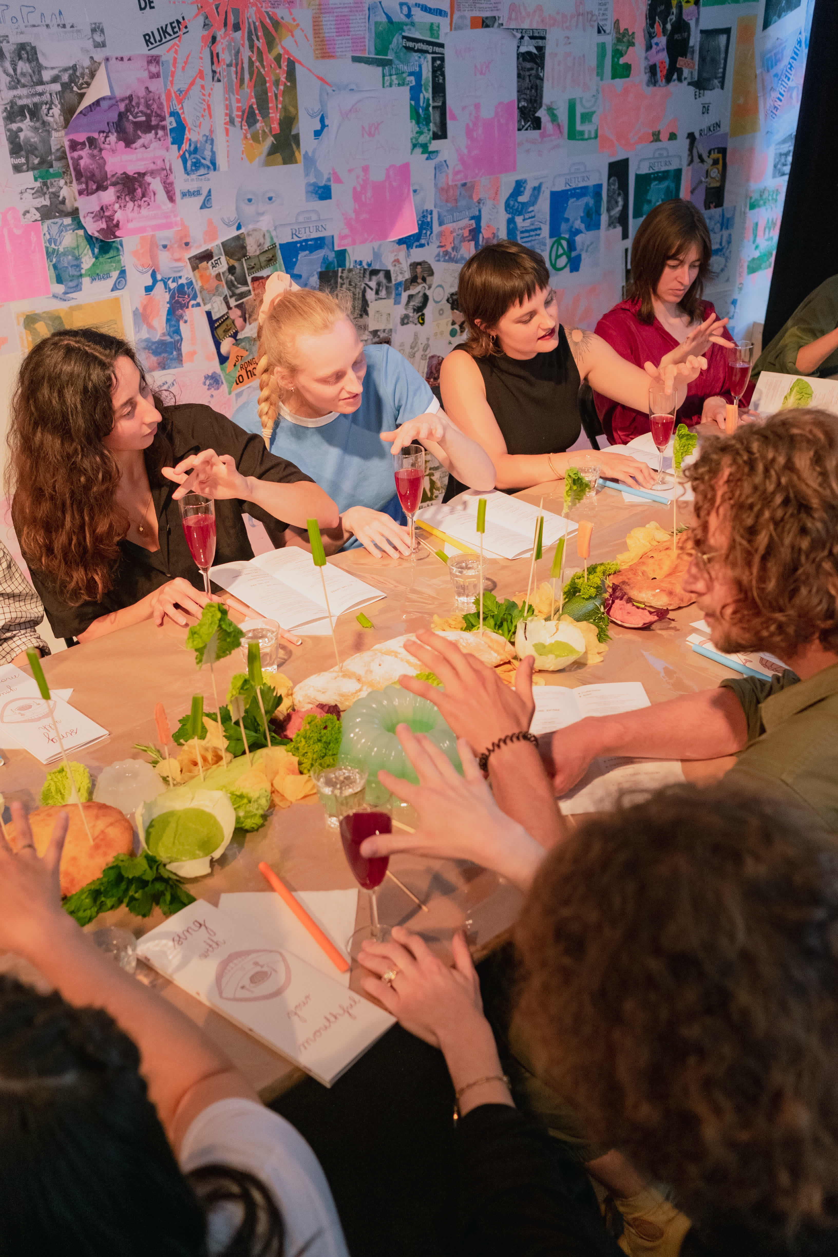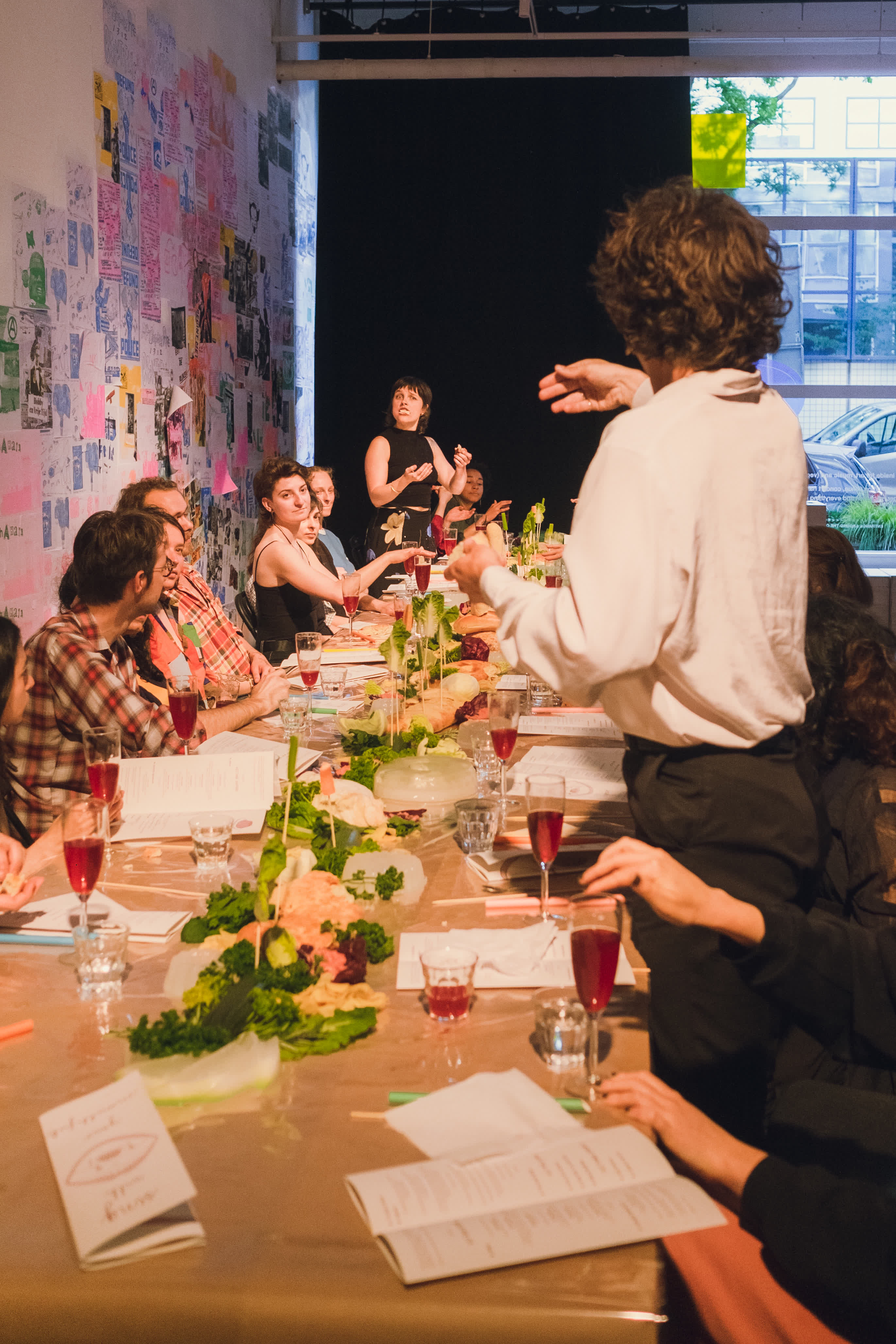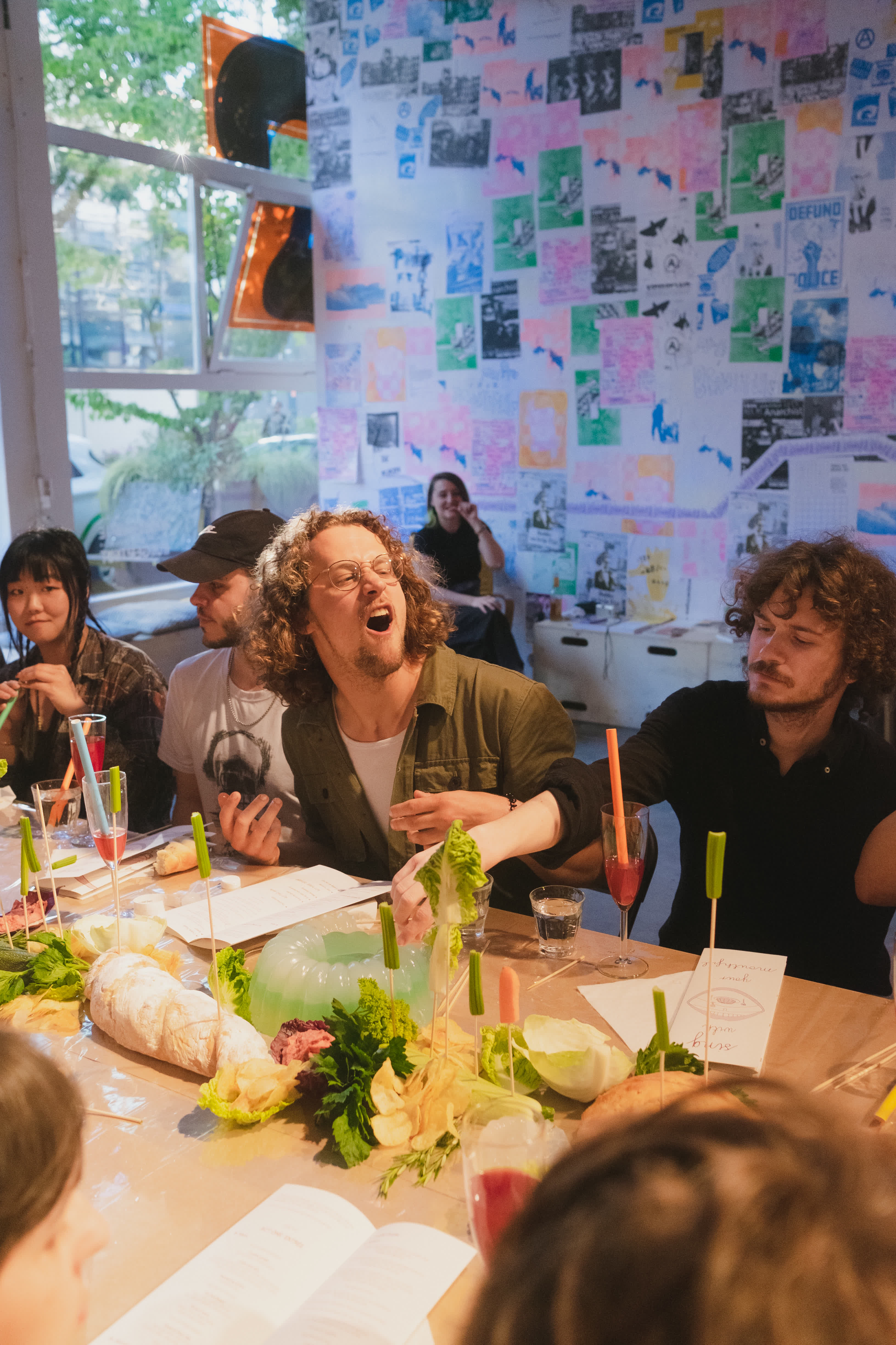 Sing With Your Mouthful is a performative banquet where food and vocal composition merge. The audience was guest, witness and participant in the experimental happening. As the dinner progressed, everything became messy both physically and sonically. There was gargling, singing with a mouthful of food, bubbles blown into the "wine," and conversations continued in shouts from one end of the table to the other. Dining conventions and etiquette were questioned, and the audience was invited to join in on everything.