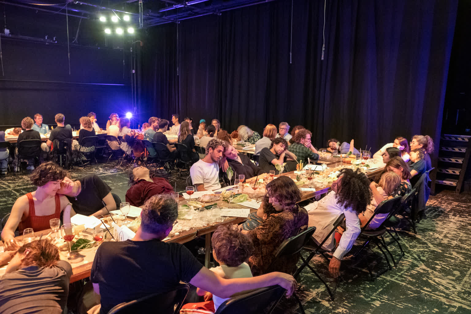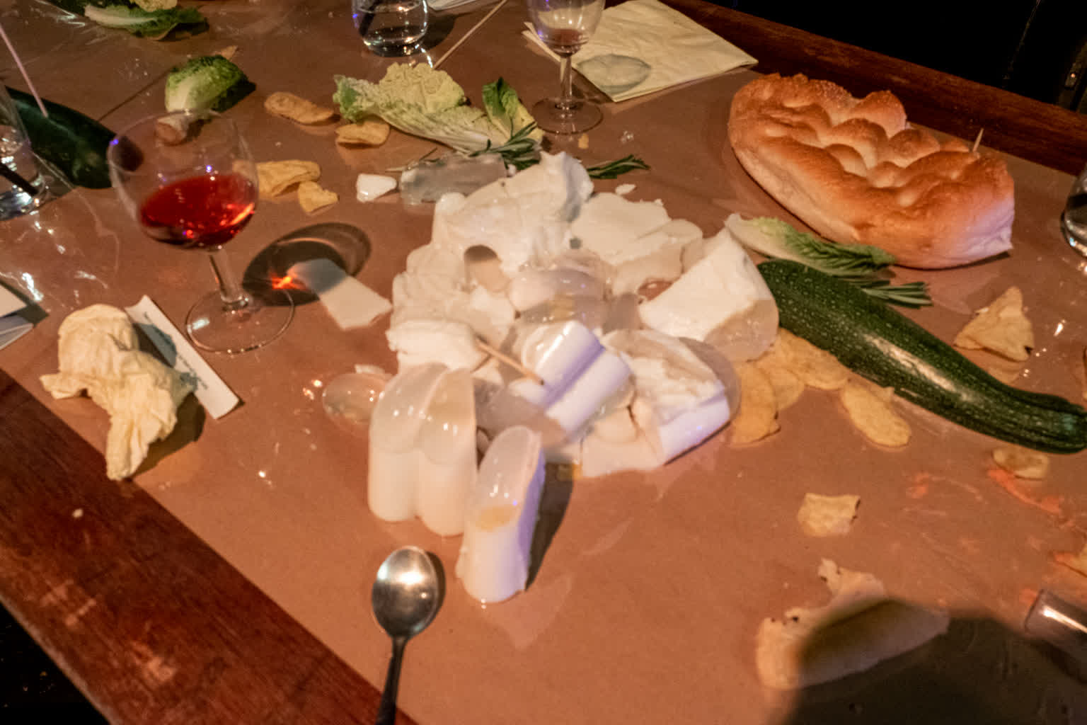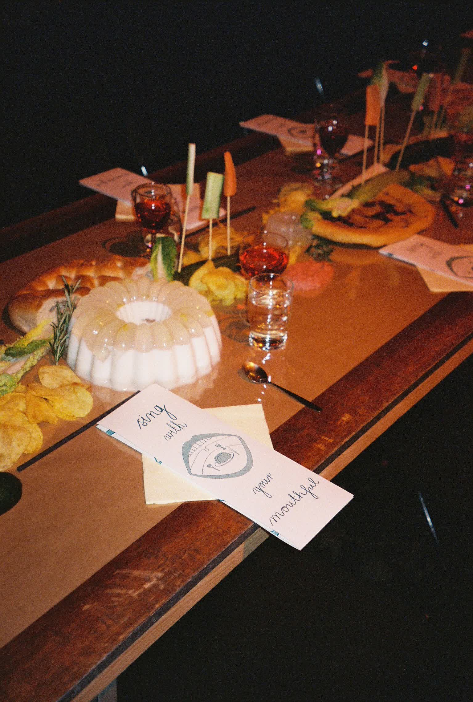 Sing With Your Mouthful is a performative banquet where food and vocal composition merge. The audience was guest, witness and participant in the experimental happening. As the dinner progressed, everything became messy both physically and sonically. There was gargling, singing with a mouthful of food, bubbles blown into the "wine," and conversations continued in shouts from one end of the table to the other. Dining conventions and etiquette were questioned, and the audience was invited to join in on everything.